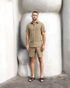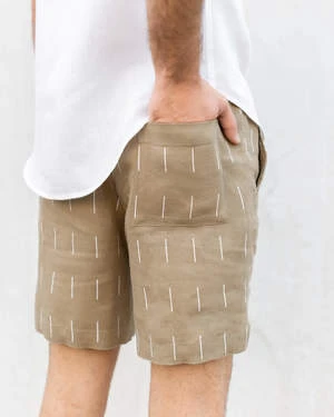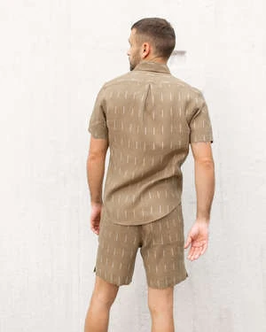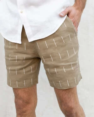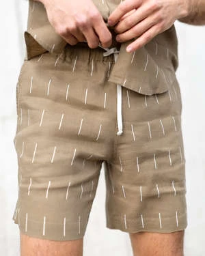 NEW: A chai brown patterned linen drawstring short made with sustainably-grown French linen and washed with biodegradable softeners.