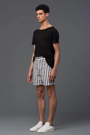 Clean, simple, & modern, this is the design ethos of CARLOS CAMPOS. The cargo pocket shorts from the brand are classic case in point. Cut from crisp cotton poplin with a bold black and white stripe, the shorts are designed for modern appeal and easy wear during warmer days.
