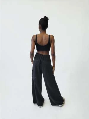 Gender-neutral tencel cargo pants with elastic waistband. Comfortable, flowing, unisex pants.