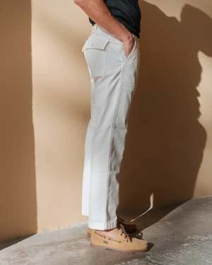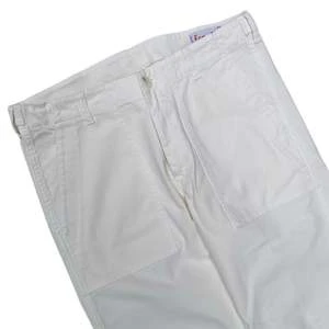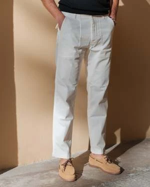 Casual fitting work pant in a herringbone cotton, 2 front slant pockets, 2 rear patch pockets, utility pocket on the right thigh, belt loops on the waist, elasticated waist and a button fly.