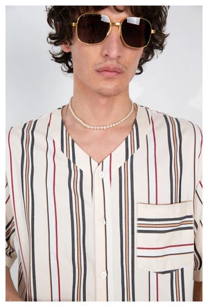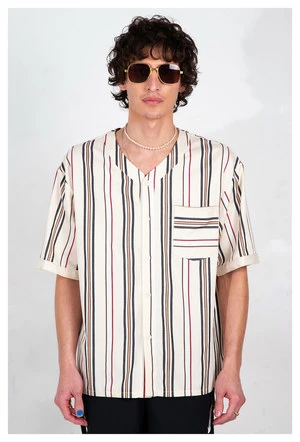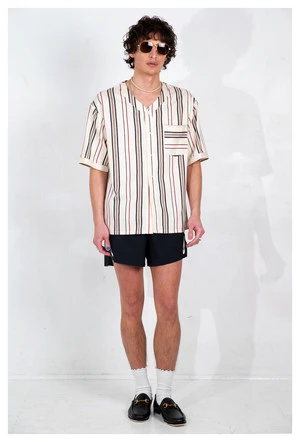 A modern update on the baseball jersey, the Valenzuela short sleeve shirt is cut in a cream Japanese cotton rayon striped twill which provides both softness and drape for an ideal summer shirt.