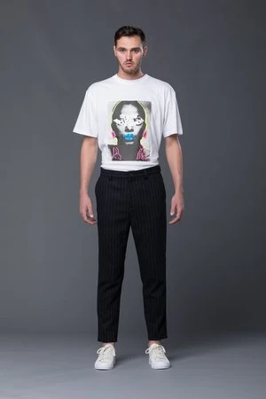 GUSTAV VON ASCHENBACH is the splinter collection from ROBERT GELLER, and the Striped Tweed Trousers achieve the goal of the brand by presenting a more streetwise aesthetic for the designer. Tailored in a Japanese pinstriped wool tweed, the trousers are slim but relaxed cut and easy to pair with your latest kicks or loafers. Injecting the style with modern cool, the pinstripe pattern elevates the style and creates a new modern classic. Worn here with the GUSTAV VON ASCHENBACH Short Sleeve Graphic Tee.