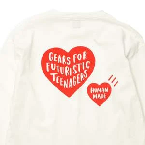 – A graphic long sleeve t-shirt with Human Made’s standard rounded body. Woven with uneven slub yarn, it has a soft texture and printed heart-shaped pattern graphic on the back.