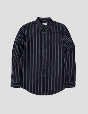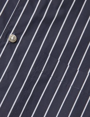 Long sleeve shirt in navy and grey with single chest pocket and side pleats at back.