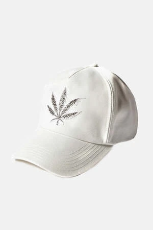 Classic white Lucien Pellat-Finet baseball cap with embroidered pot leaf adorned with silver crystals.