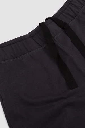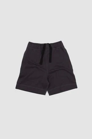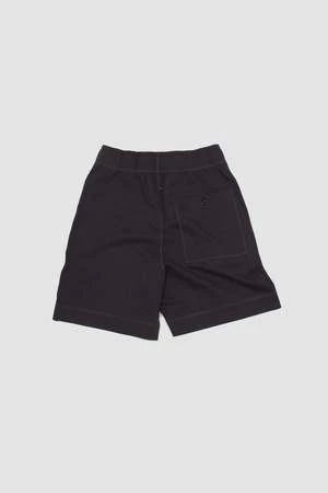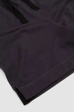 Organic cotton loopback jersey short. Relaxed fit. Elasticated waist with herringbone drawcord. Concealed side pockets. Button-through patch back pocket. Flatlock stitch detailing.