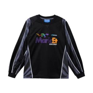 Breathable jersey with embroidered art.