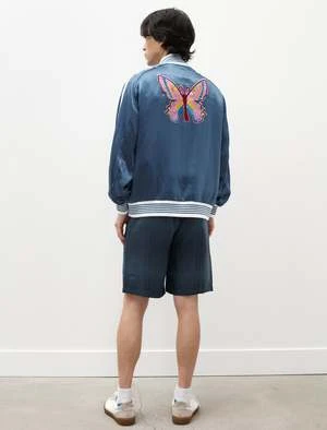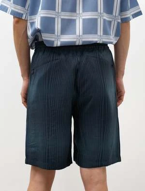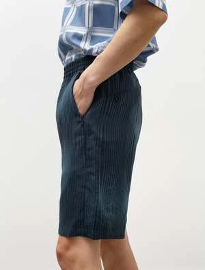 Relaxed fitting, knee length shorts cut from a lustrous, rayon jacquard satin with a two tone wave stripe. Features an elastic waistband with an internal self drawstring, front and back on-seam pockets with invisible zipper closures. Fully lined in a contrasting purple satin to provide improved durability and more resistance to wear.