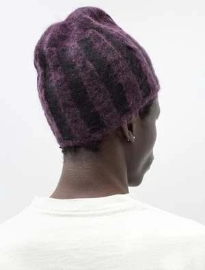 A full fashioned short cut beanie knit from merino / mohair blended yarn in a deep eggplant purple. Features a duo rib pattern with alternating stripes in a brushed, hairy finish and a smooth finish. Full fashion construction eliminates all seams creating a smooth finish at the interior for maximum wearing comfort.