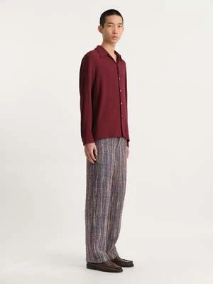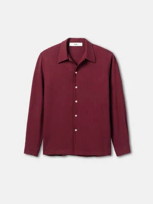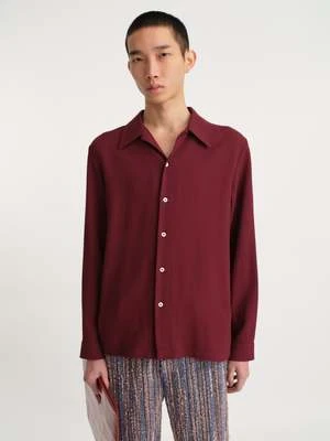Sefr’s Rampoua Shirt is made from a Bulgarian viscose/wool crepe cloth. It features a large collar, mother of pearl button closure and a pleated detail on the back.