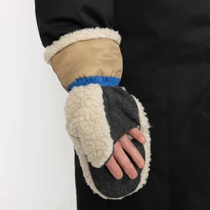 A pair of teddy mittens with felted fabric in the palm. Made with a windstopper rib around the wrist, and a logo on the back of the hand