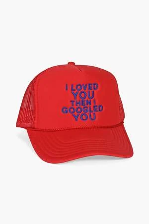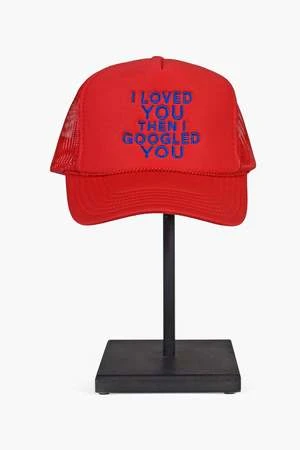 the “stacked” trucker hat has a Five panel high profile with a mesh back and “I loved you then I googled you” embroidery in the front. this hat has an adjustable snap-back.