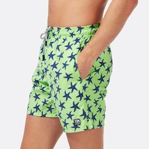 Classic style Tom & Teddies with an elasticated waist and tough drawcord, these zingy green and blue swim shorts feature our bold Starfish print from the Aquatic Collection. These are trunks that are destined for long sunny beach days, and theyll definitely perk-up any summer vacation kit with a blast of bright color! Team them with a navy tee and wear them all day long, in or out of the water.